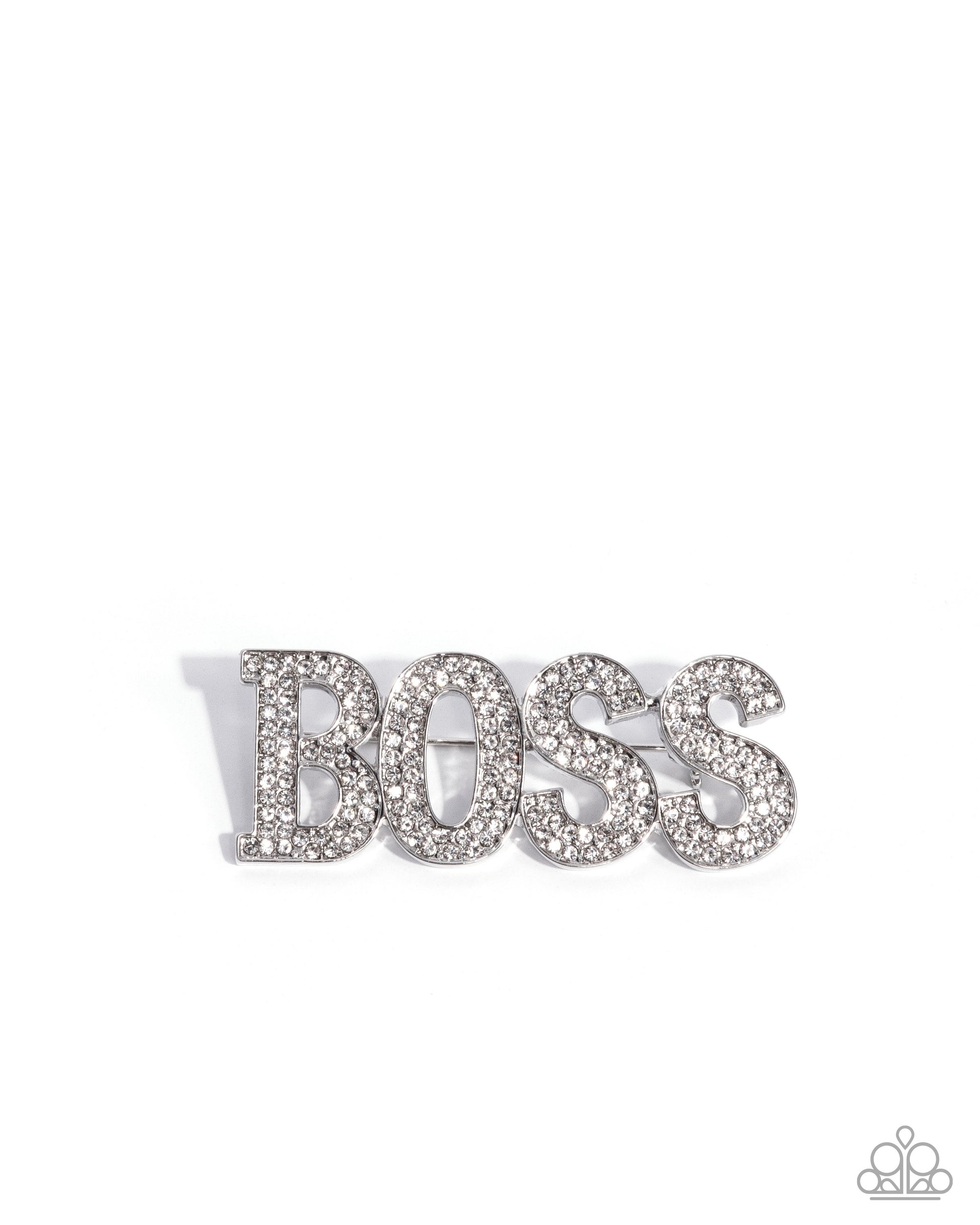 Embossed in dainty white rhinestones, glistening silver letters spell out the word "BOSS" reflecting light in every direction for a corporate chic centerpiece. Brooch measures approximately 1/2" in length and 2" in width. Paparazzi Accessories