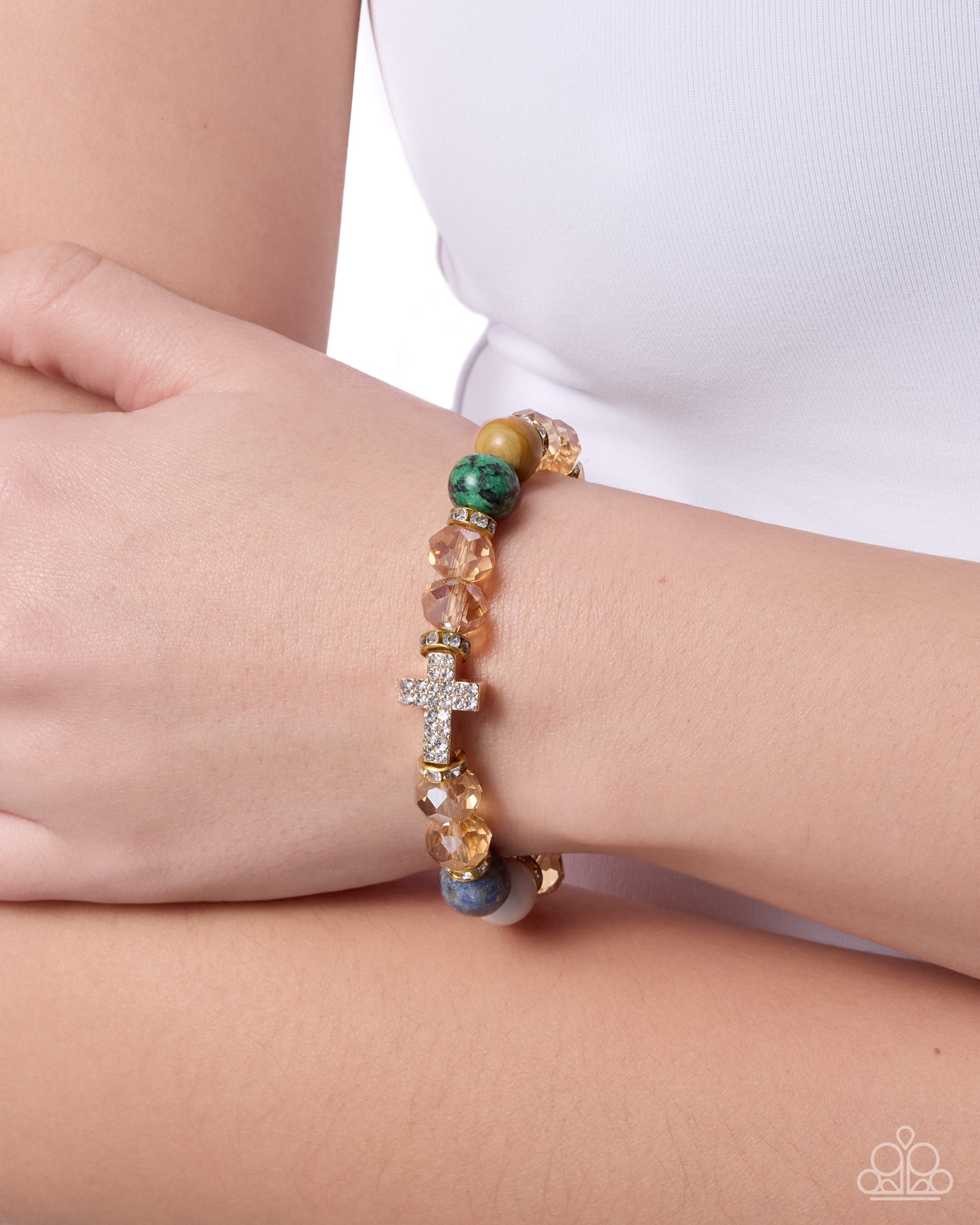 Infused along an elastic stretchy band, a collection of smoky champagne beads, multicolored natural stone beads, white rhinestone-dusted gold rings, and white rhinestone-embellished gold crosses on their sides pattern around the wrist for a celestially chic display. As the stone elements in this piece are natural, some color variation is normal.