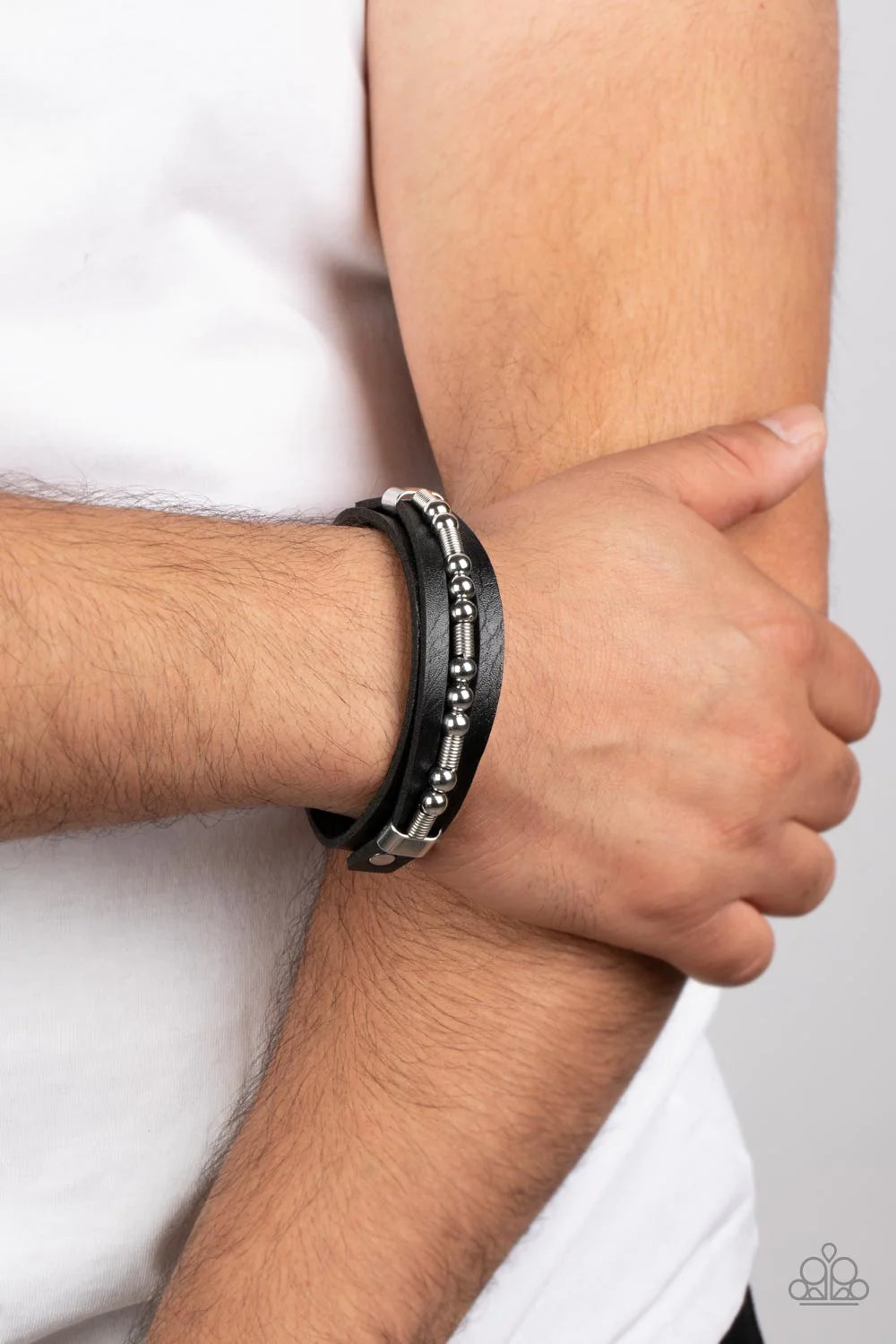 A row of coiled silver accents and silver beads are threaded along the front of a spliced black leather band that is studded in place across the front of a black leather band, resulting in an edgy centerpiece around the wrist. Features an adjustable snap closure.