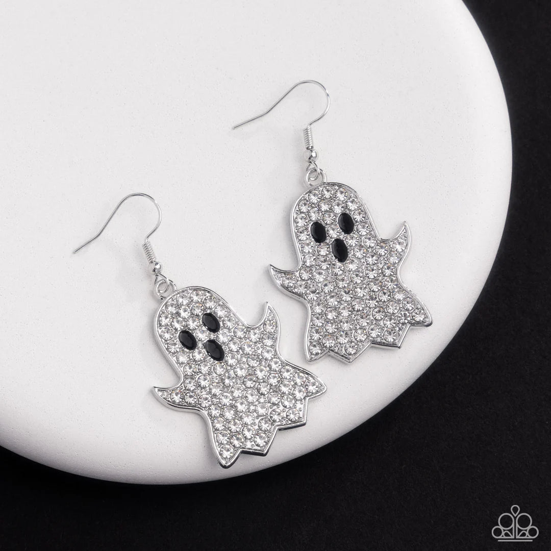Featuring black-painted details, a white rhinestone-embellished silver ghost with curled ends spookily shimmers below the ear for a Halloween-inspired lure. Earring attaches to a standard fishhook fitting.