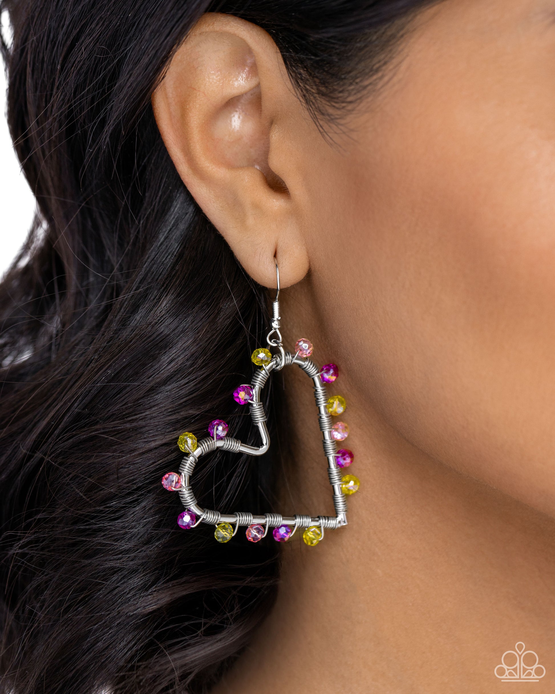 A faceted collection of multicolored beads is wrapped along the outside curve of a shiny, silver heart frame by shimmery silver wire for a handcrafted, fun-loving finish. Earring attaches to a standard fishhook fitting.