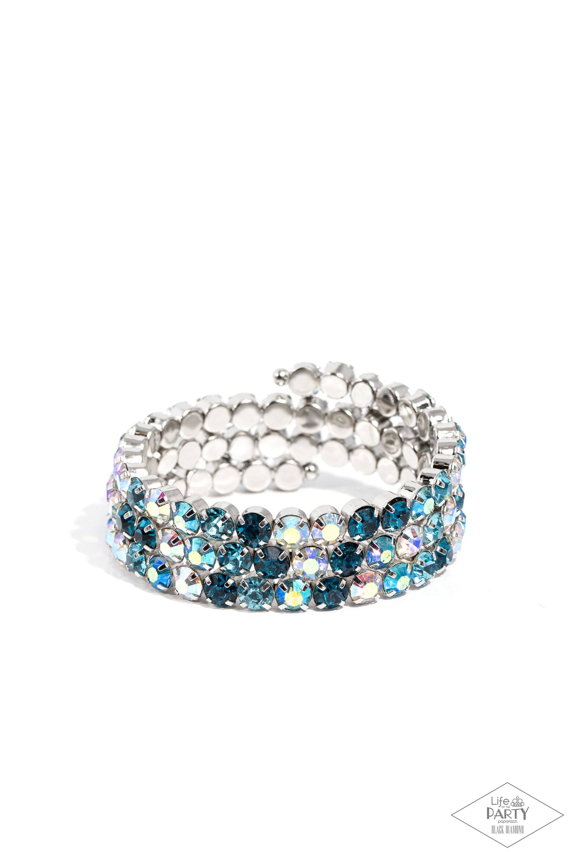 Three glistening rows of blue and iridescent gems, pronged in place by silver fittings, curl along a coiled wire, creating a blinding infinity wrap style bracelet around the wrist. Due to its prismatic palette, color may vary. Paparazzi Accessories