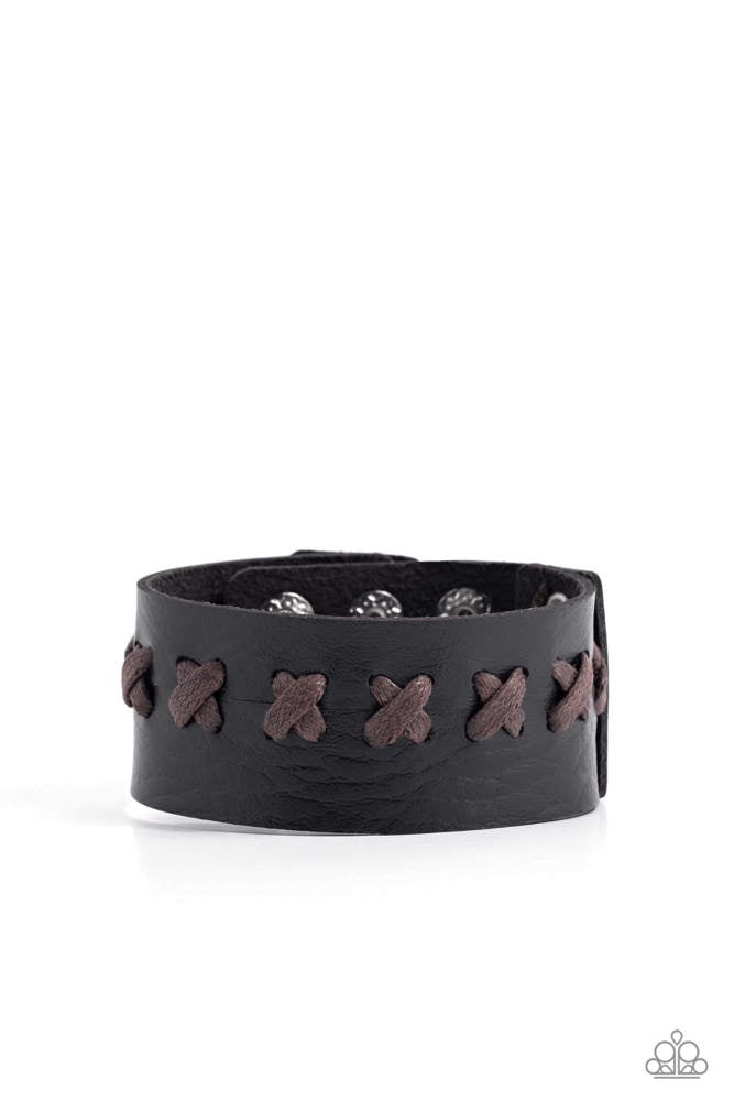 Brown laces are threaded through two pieces of black leather, creating crisscrossed stitches that hold the rustically studded centerpiece together. Features an adjustable snap closure. Sold as one individual bracelet.