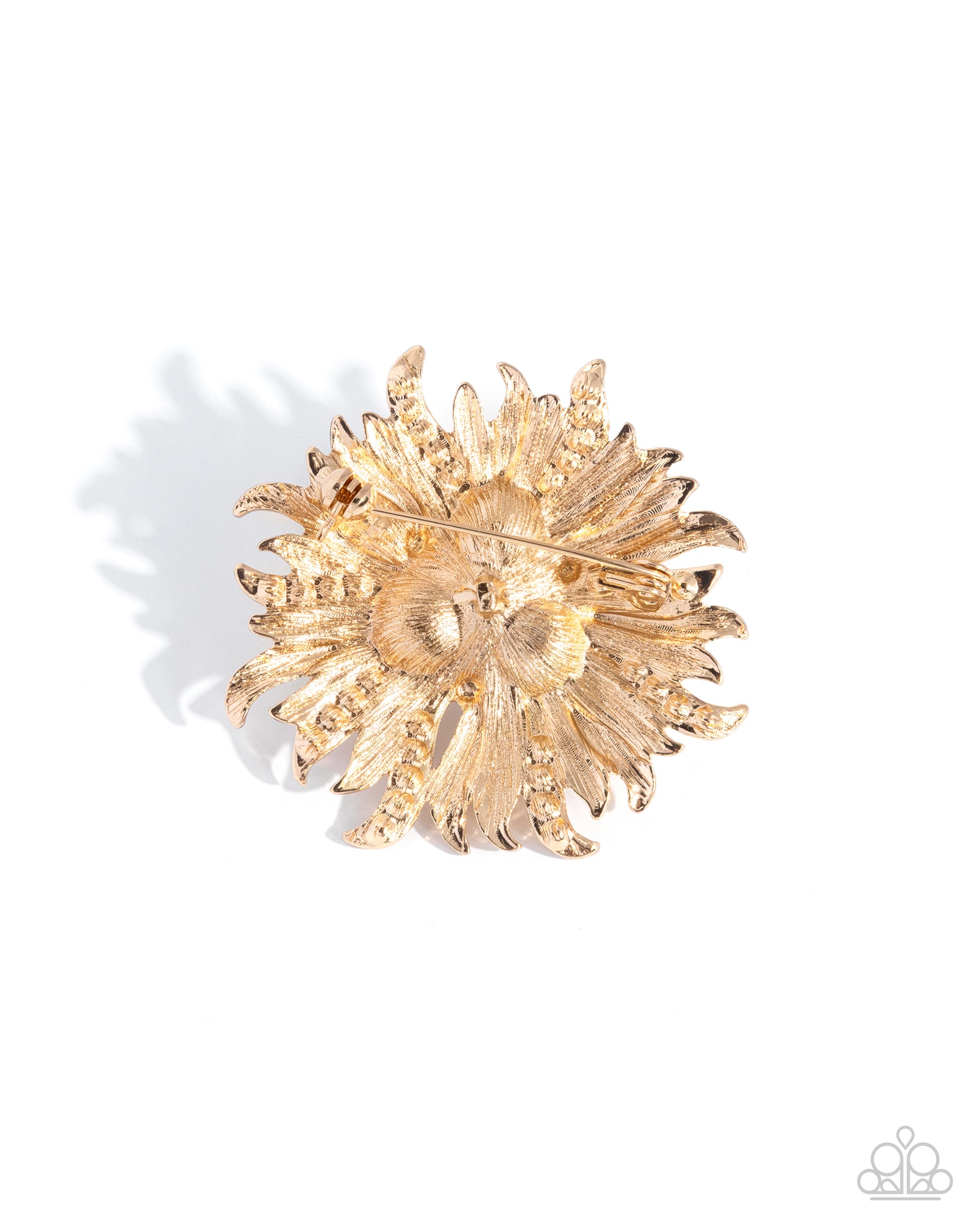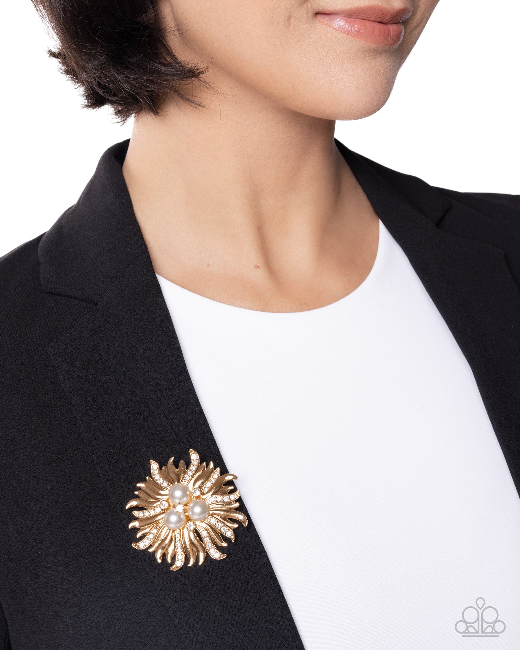 Featuring oversized pearls and white rhinestone detailing, a textured, glistening gold sun stands out for a radiant, refined display. Brooch measures approximately 2" in length and 2" in width. Paparazzi Accessories