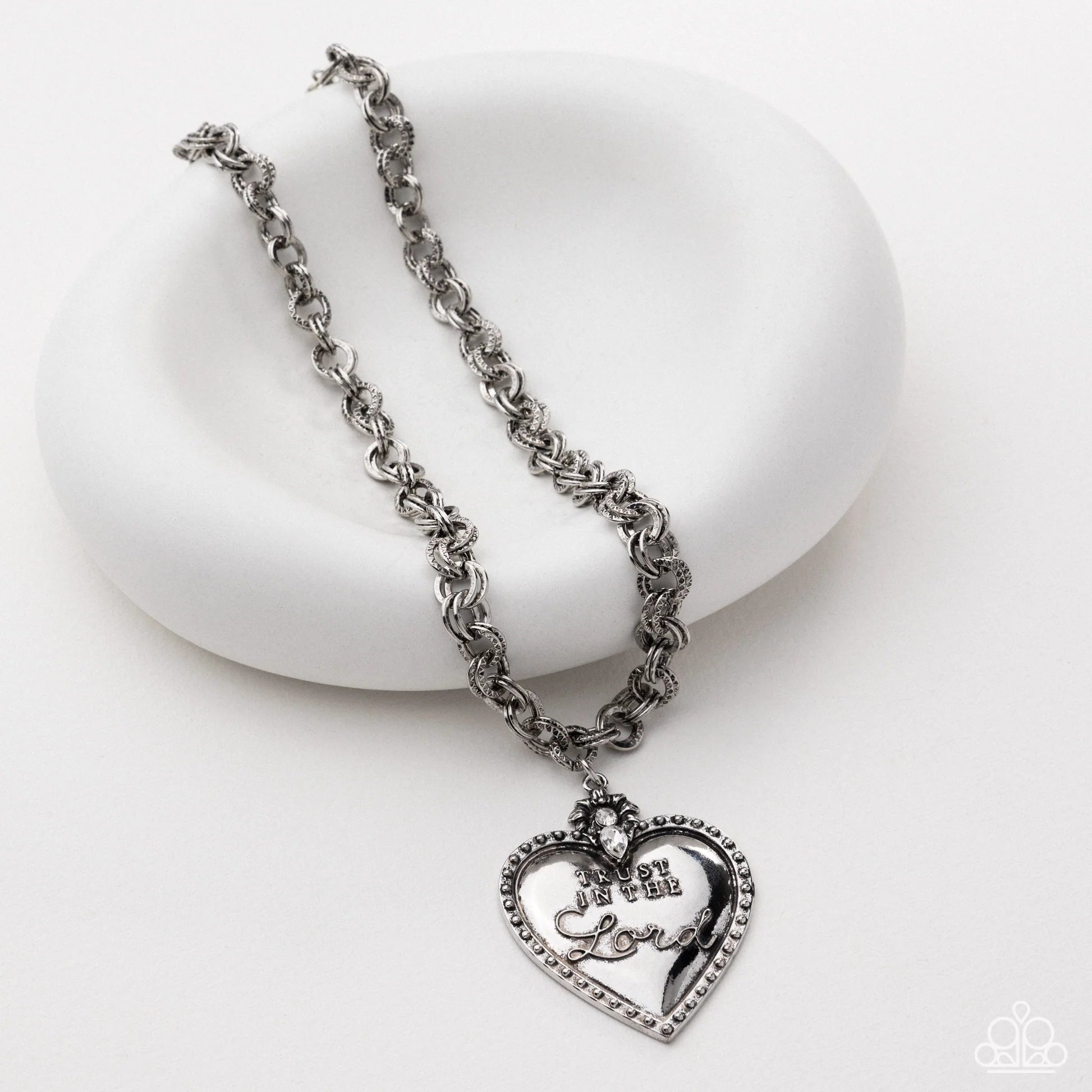 Copious hammered and sleek silver rings layer and coalesce below the neckline, proudly showcasing a stud-embellished antiqued silver heart pendant. A faceted white rhinestone and upside-down teardrop gem stack atop one another, crowning the top of the heart inside a silver flower, while the phrase "Trust in the Lord" in both cursive and bold fonts is embellished across the center of the pendant for an inspirational finish. Features an adjustable clasp closure.