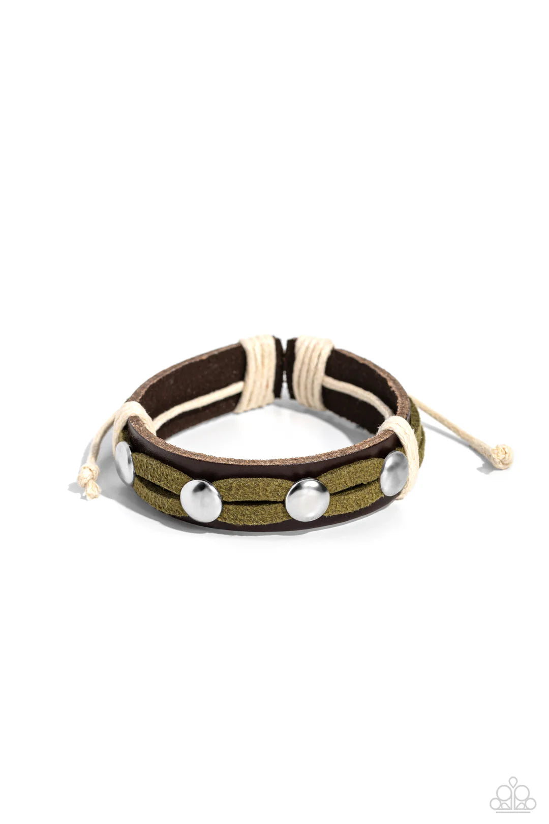 Loops of green suede are studded and knotted in place across the front of a brown leather band, resulting in a spirted southwestern display around the wrist. Features an adjustable sliding knot closure.
