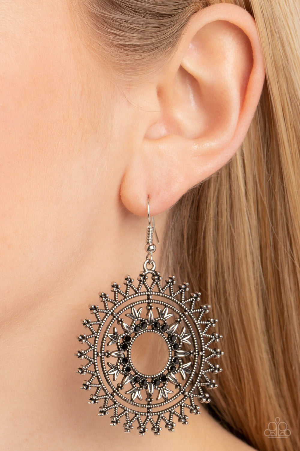 Layers of leafy silver frames, studded rings, and a border of zigzagging triangular accents ripple out from a black rhinestone encrusted center for a glitzy pop of color. Earring attaches to a standard fishhook fitting.
