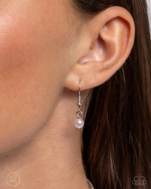 A duo of white rhinestones in silver square fittings collides with layers of baby pink pearls to create a refined blend of color and glitz along the collar. The sleek rhinestones are tied around the bubbly pearls linking through additional white rhinestone-dusted square fittings, perfectly balancing the contrasting design. Features an adjustable clasp closure. Paparazzi Accessories