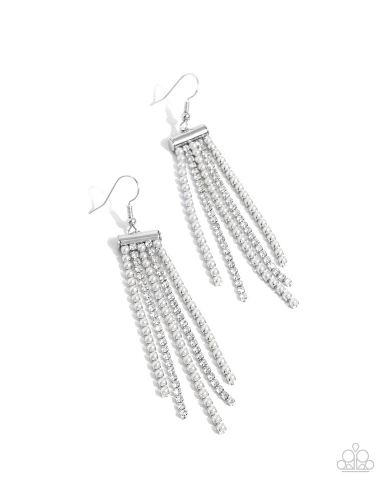 Strands of glistening dainty white pearls dance beside dainty white rhinestones in silver-pronged fittings from a silver horizontal bar, tapering and dripping below the ear for a dazzling look. Earring attaches to a standard fishhook fitting.