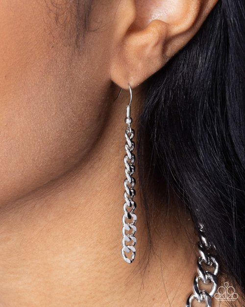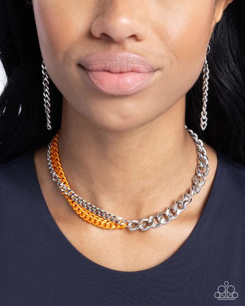 A colorful collection of orange-painted silver curb chains and a solitaire silver curb chain boldly pairs with a gritty, oversized silver curb chain around the collar, interlocking through a silver jump ring at the center of the design, resulting in an intense industrial look. Features an adjustable clasp closure.